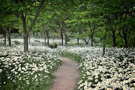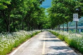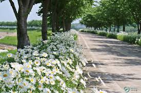 - 의령에는 양옆으로 샤스타데이지와 양귀비, 수레국화가 가득 심어진 긴 길이 있습니다.